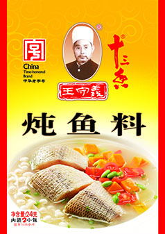 2、黃燜魚(yú)塊湯:魚(yú)塊(約1千克)拌面過(guò)油后,放入約2.5千克水的鍋中,加鹽適量,同時(shí)加入本品料包一個(gè),文火燜(燉)約10分鐘即可。